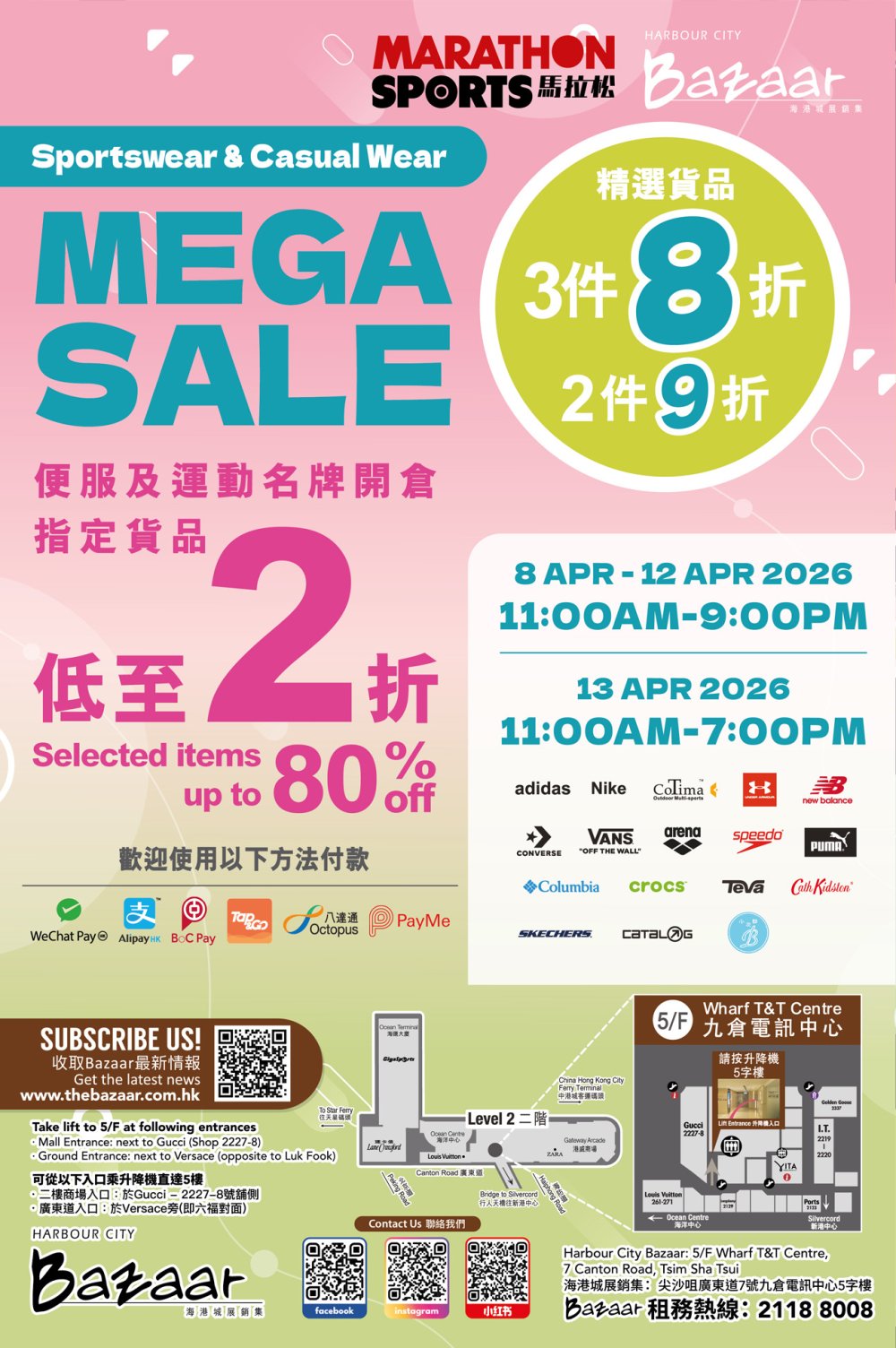 名牌运动服饰﹑波鞋及便服低至2折! Nike, Adidas, Reebok, Converse, New Balance, Columbia 等精选货品买2件额外9折,买3件额外8折!